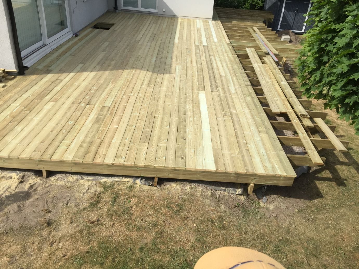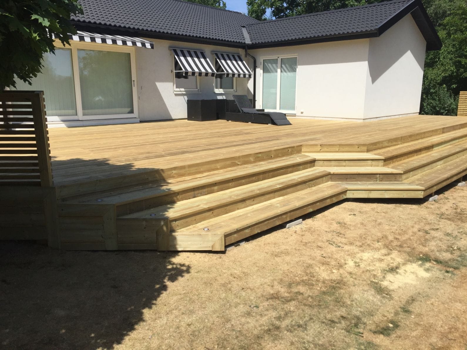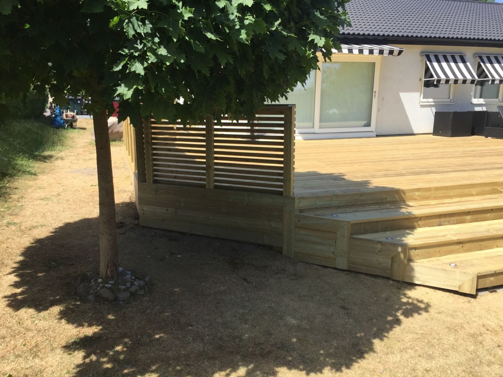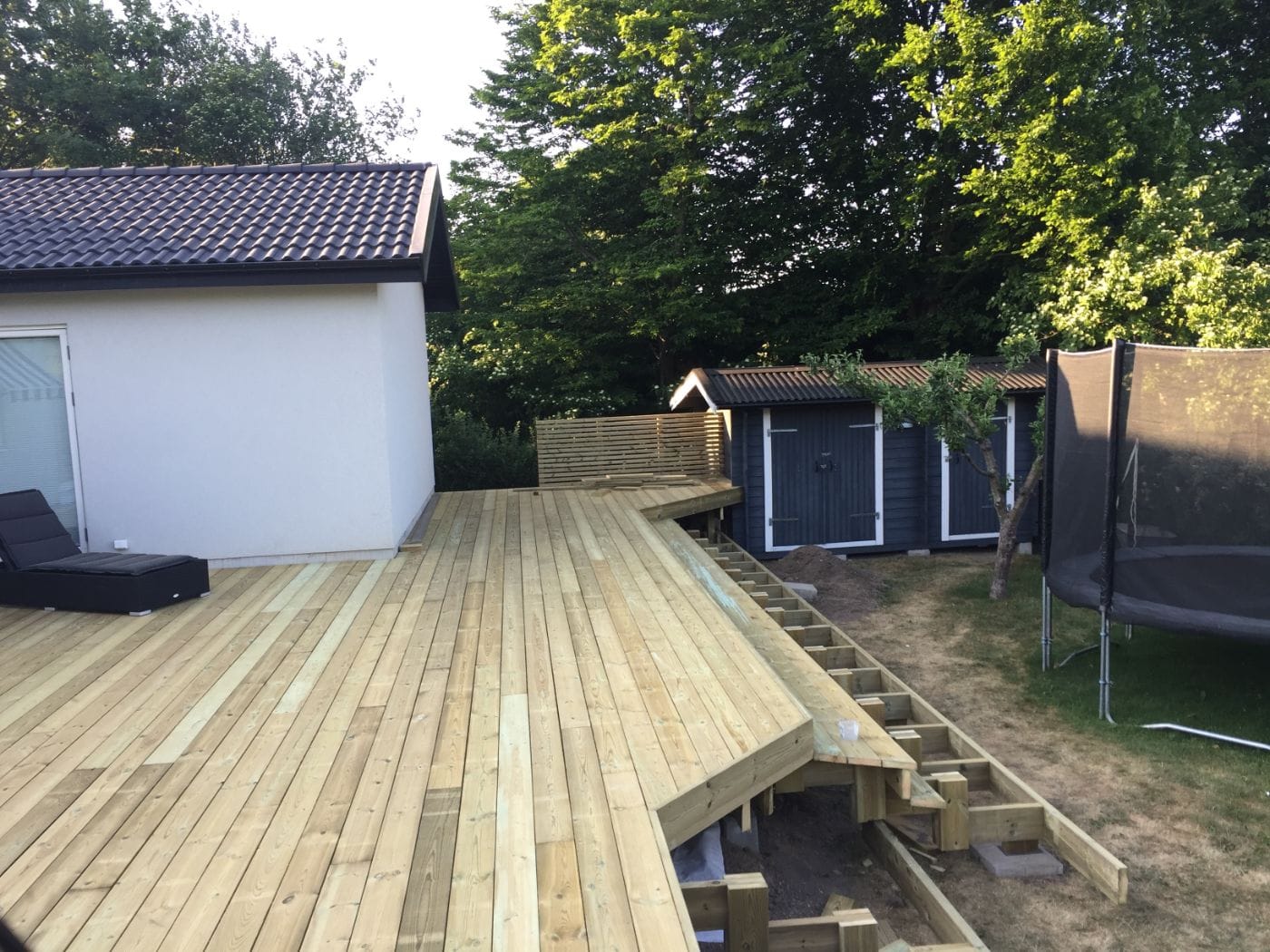 I Södra Sandby byggde vi en uteplats av tjockare och bredare brädor än vad man brukar använda. De ovanligt utformade trapporna gör ett vackert intryck.
