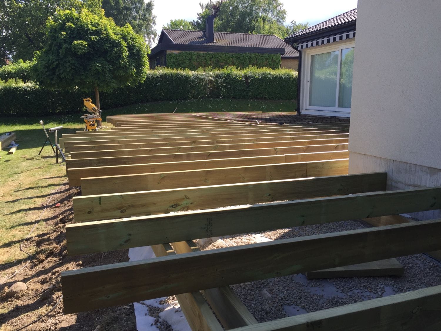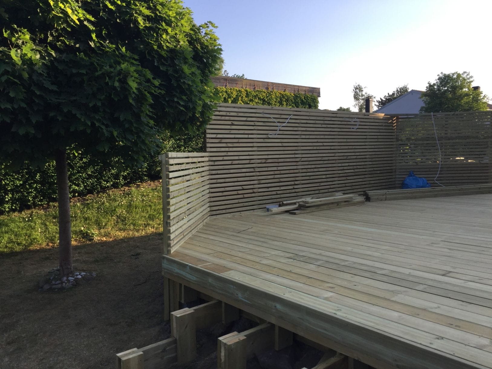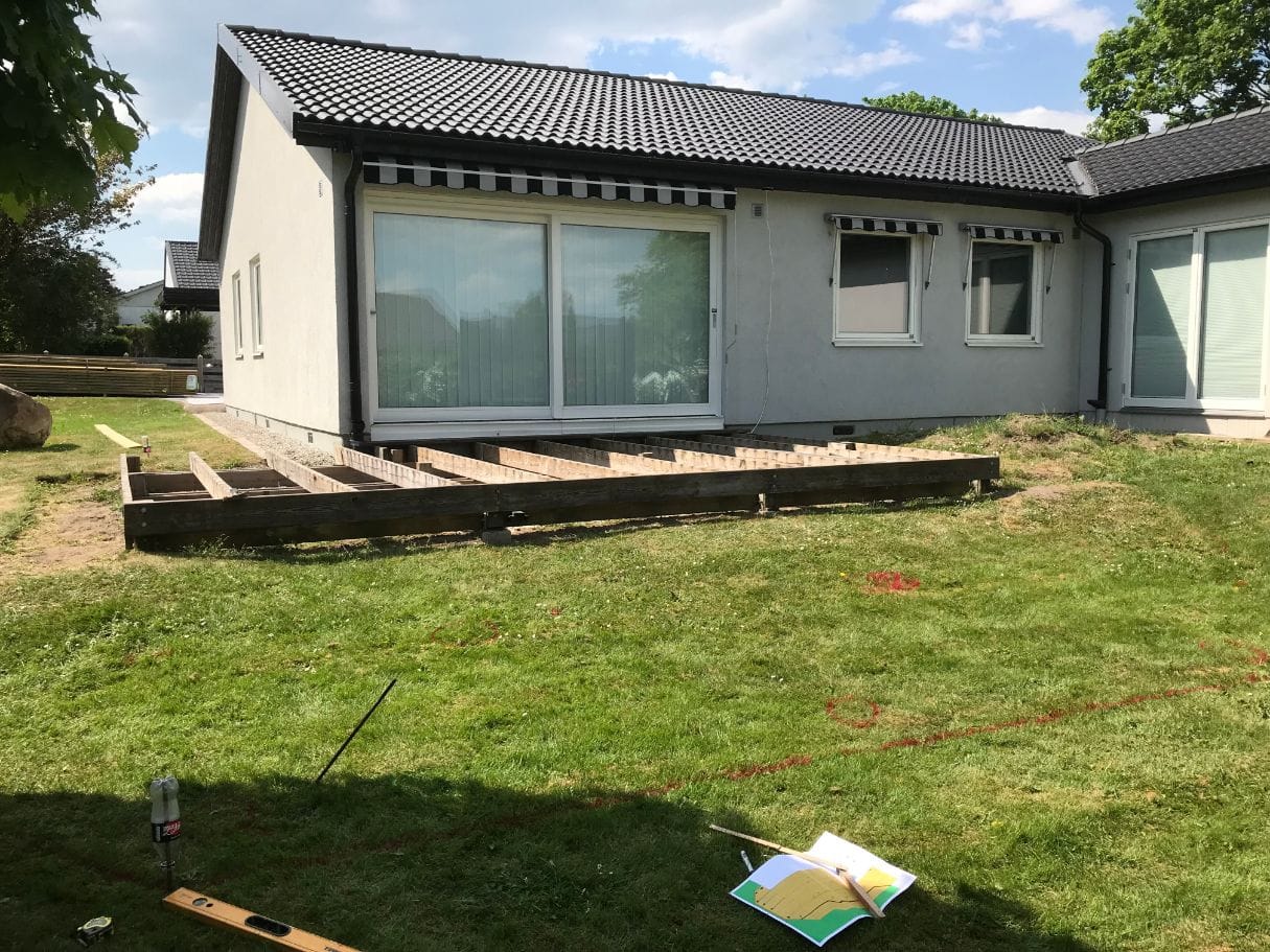 I Södra Sandby byggde vi en uteplats av tjockare och bredare brädor än vad man brukar använda. De ovanligt utformade trapporna gör ett vackert intryck.