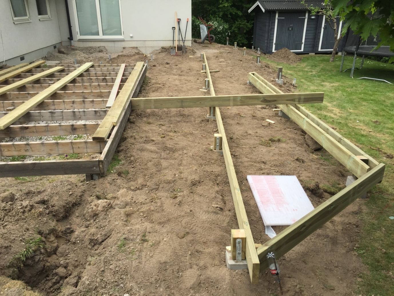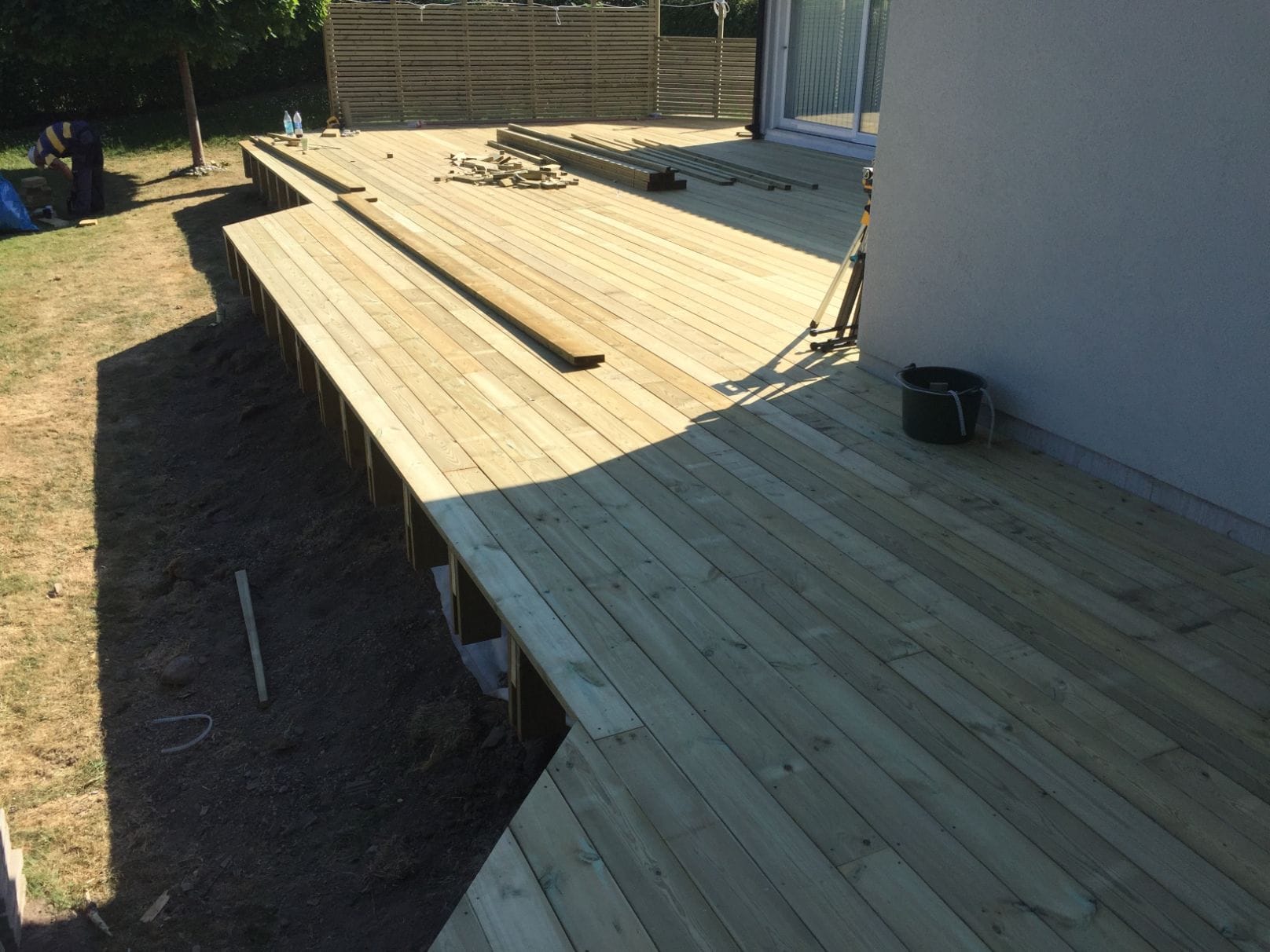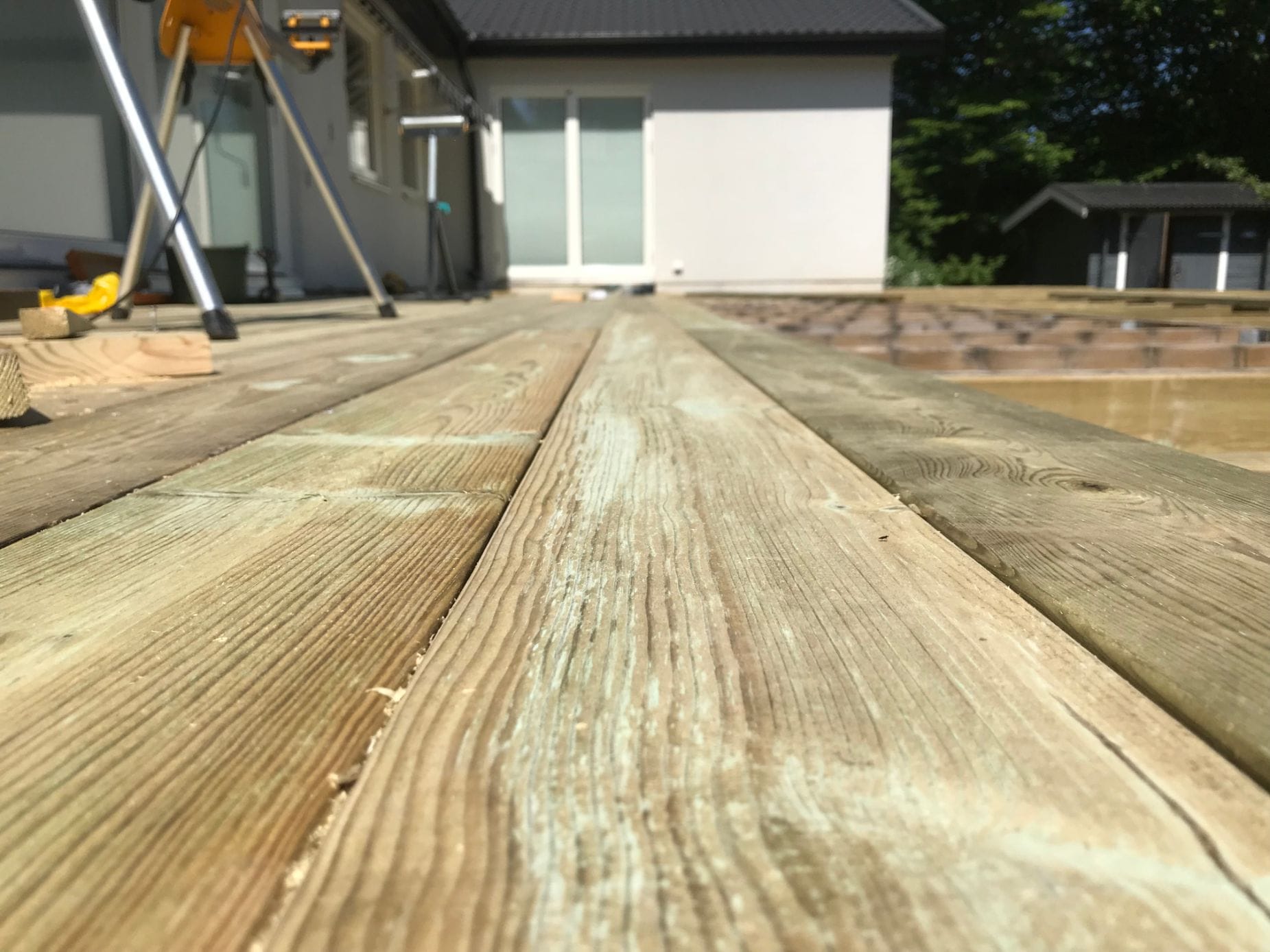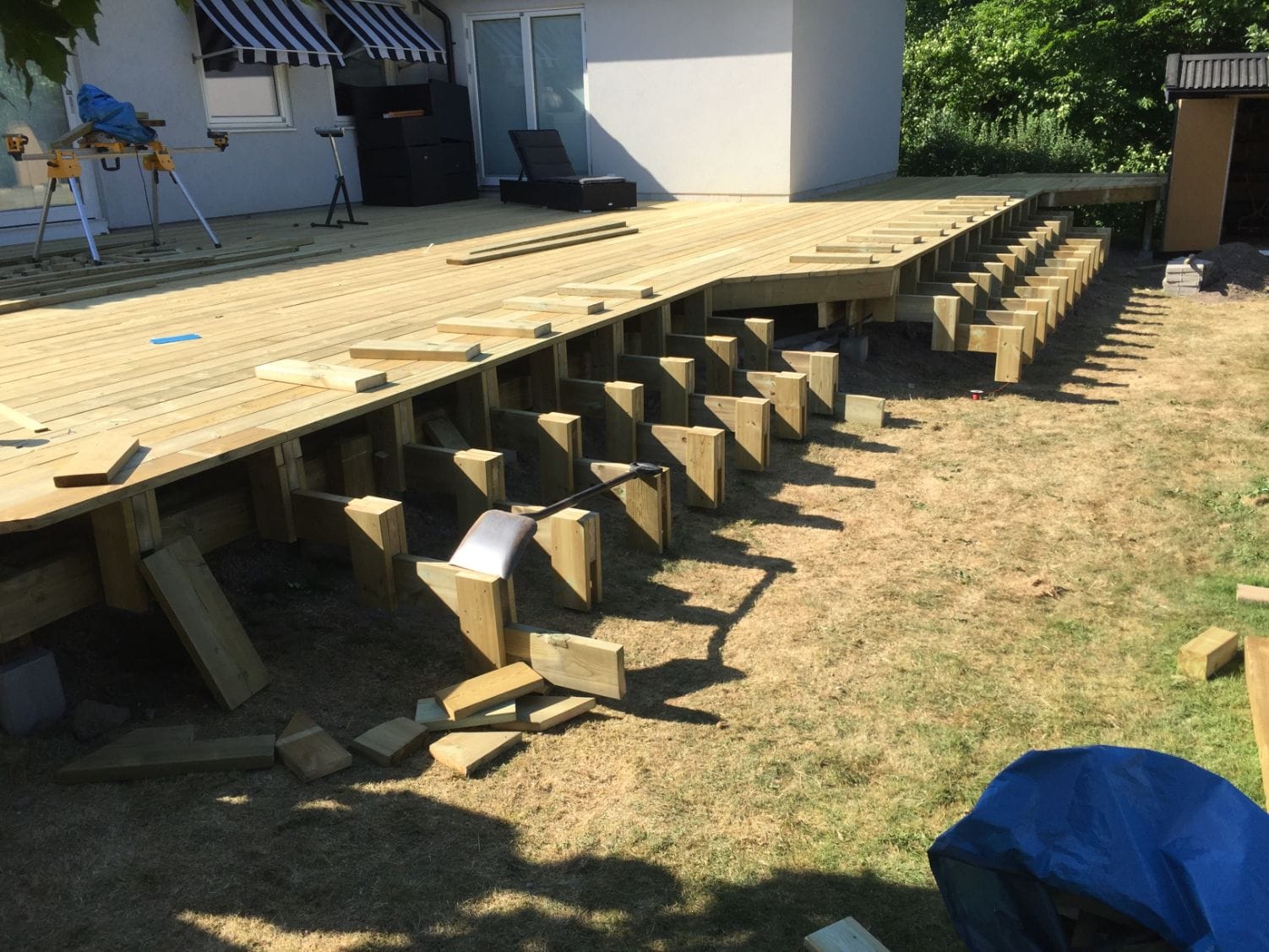 I Södra Sandby byggde vi en uteplats av tjockare och bredare brädor än vad man brukar använda. De ovanligt utformade trapporna gör ett vackert intryck.