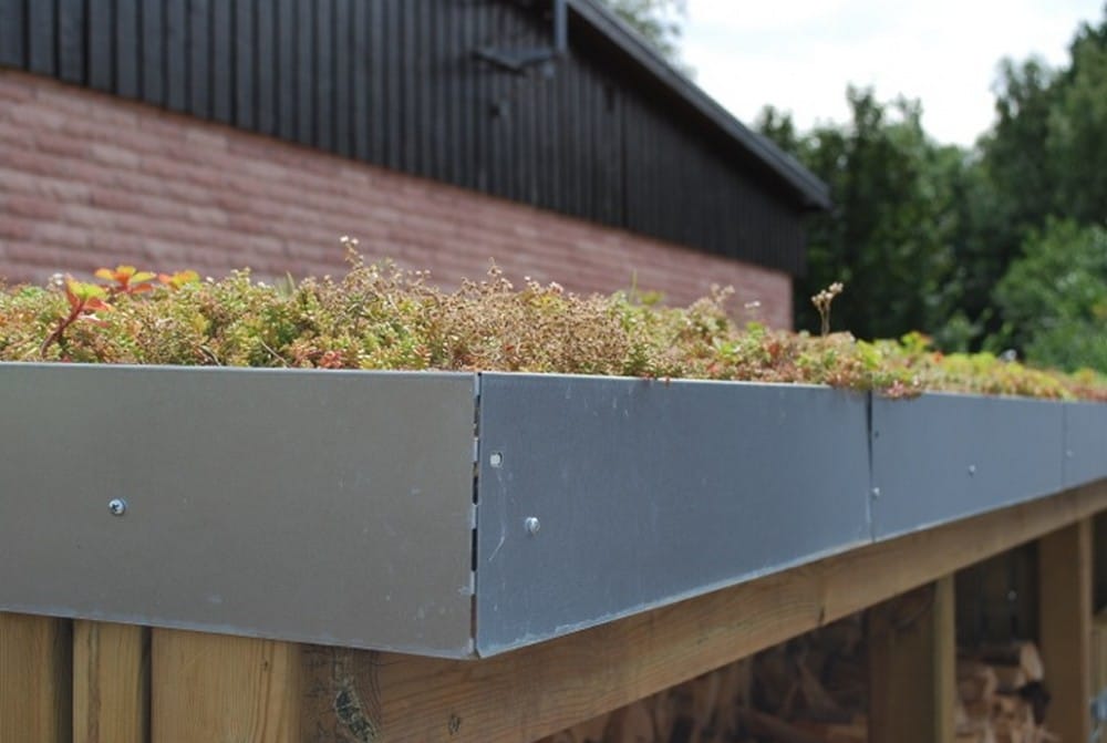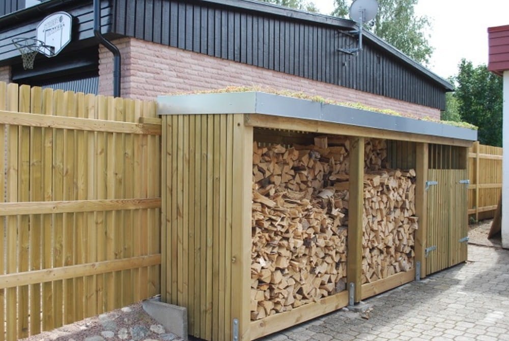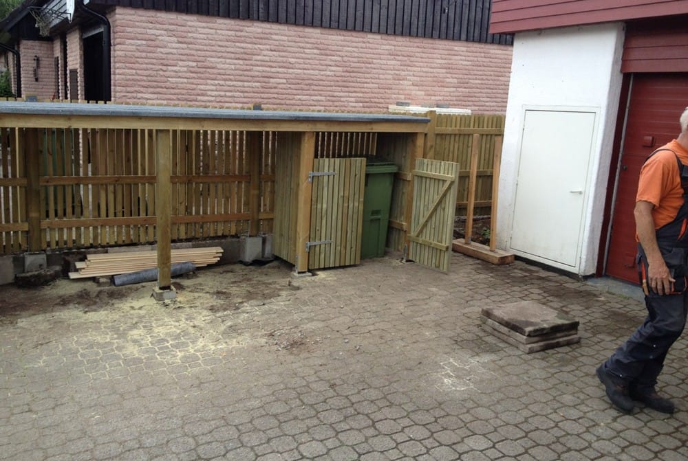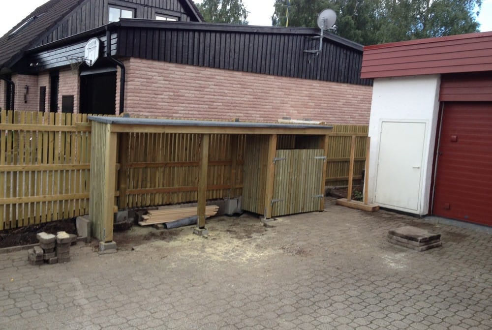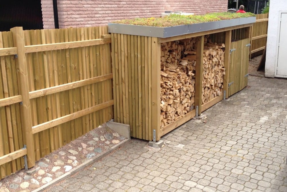 I Furulund skapade vi ett vedförråd med ett litet utrymme för soptunnor. Allt täcktes med ett vackert sedumtak. Vi byggde även ett kort staket på tomtgränsen.
