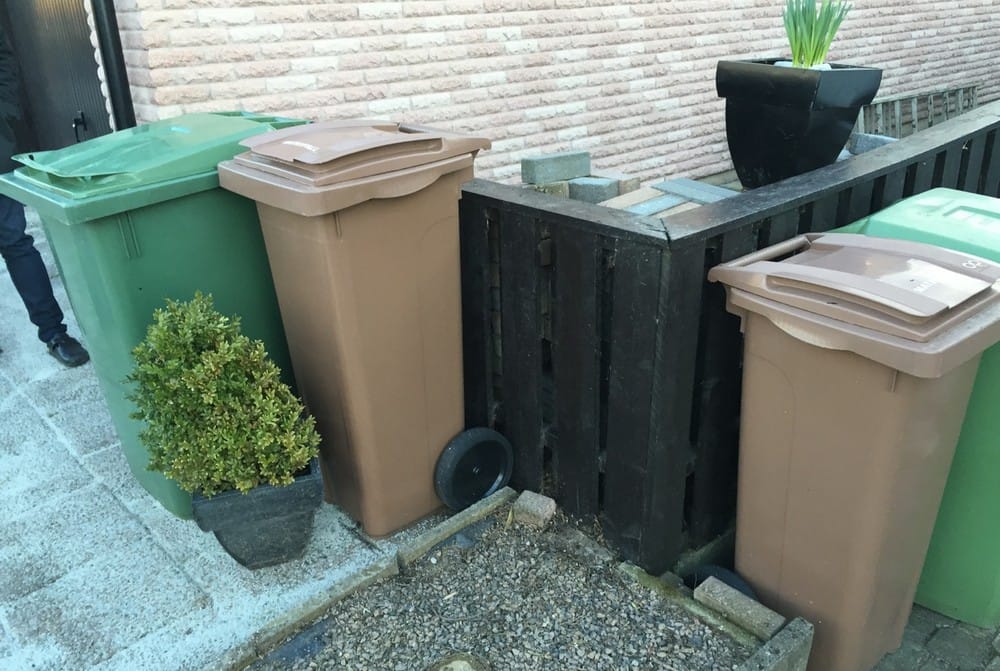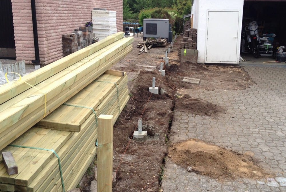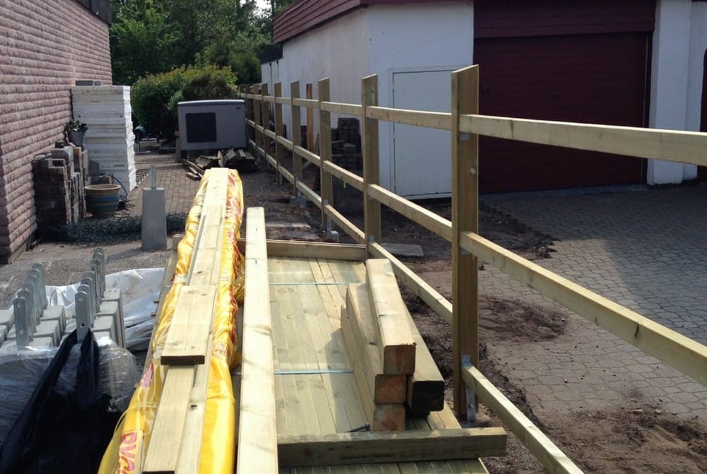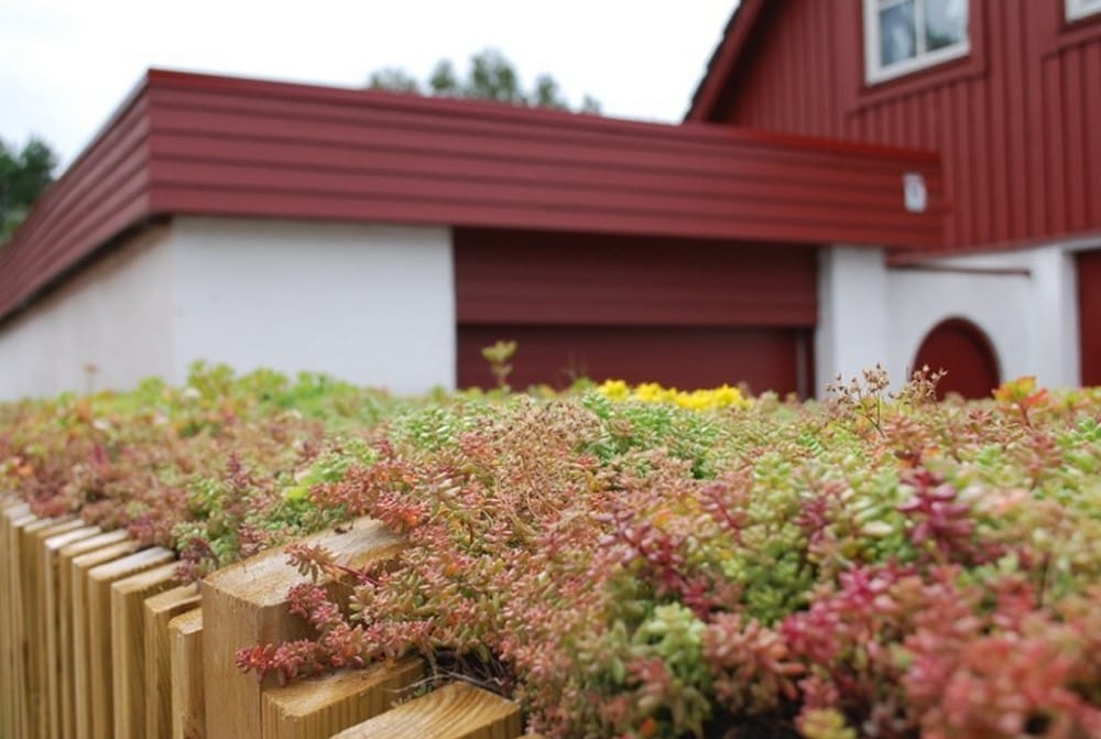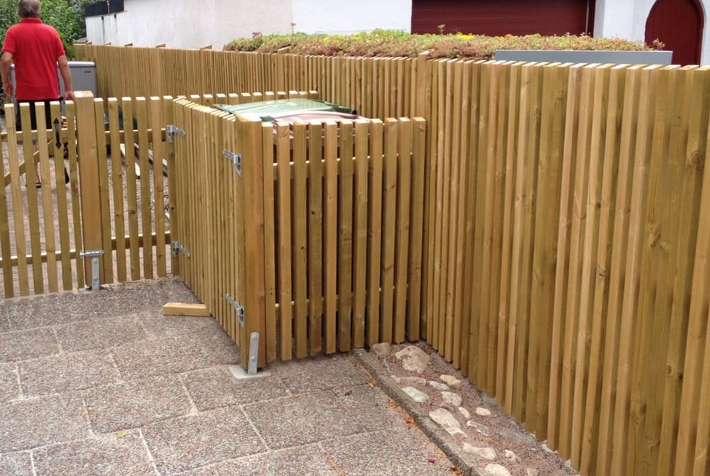 I Furulund skapade vi ett vedförråd med ett litet utrymme för soptunnor. Allt täcktes med ett vackert sedumtak. Vi byggde även ett kort staket på tomtgränsen.